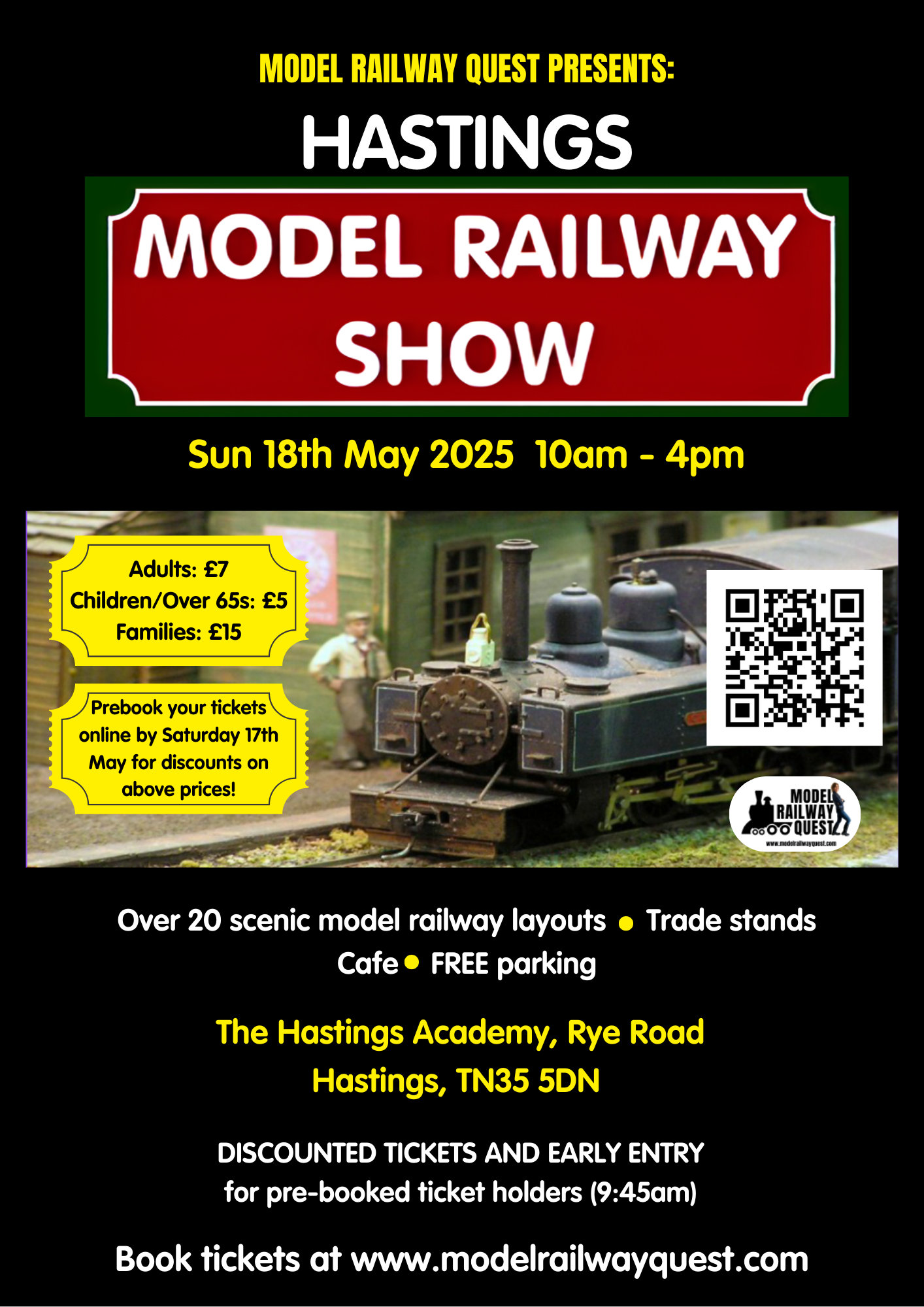 A model railway show is returning to Hastings with 20 fully scenic layouts on Sunday 18th May at The Hastings Academy, Rye Road, Hastings. 10am to 4pm. Ticket info at http://www.modelrailwayquest.com